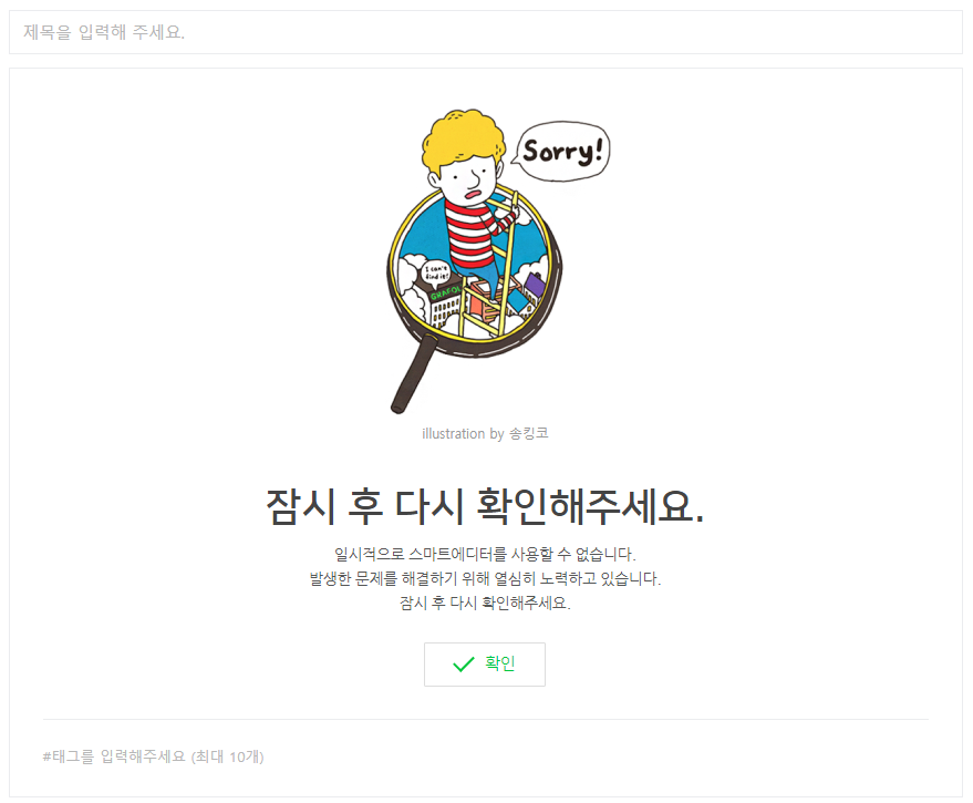 네이버 카페에서 있었던 오류이다. 1시간 이상 지속된 오류임에도 마치 5분 뒤에 다시 오면 될 것 처럼 안내가 되어 있다. 아마 예기치 못한 오류 상황에 일률적으로 보여주는 화면일 것이라 추정된다. 하지만 이런식의 화면을 띄울 경우 급한 용무가 있는 사용자는 분단위로 들어와보게 된다.