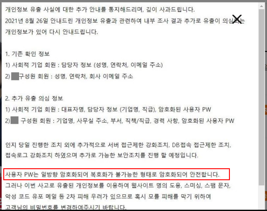 "일방향 암호화되었기 때문에 안전합니다." 물론 해당 기업에선 정말 자신이 있을 수도 있지만, 정보주체(이용자) 측면에선 저 말을 믿지 말라. 이 말을 하기 위해 긴 글을 적었다. 믿지 말라고 해서 거짓말한다고 단정짓고 소송을 제기하란 것이 아니다. 그냥 변동 없이 오랫동안 사용만 해도 안전하지 못한 것이 비밀번호인데, 저렇게 유출까지 된 상황이라면 내 비밀번호는 더 이상 안전하지 않다고 생각하고 바꾸는 것이 당신을 위해 이롭다는 것이다.