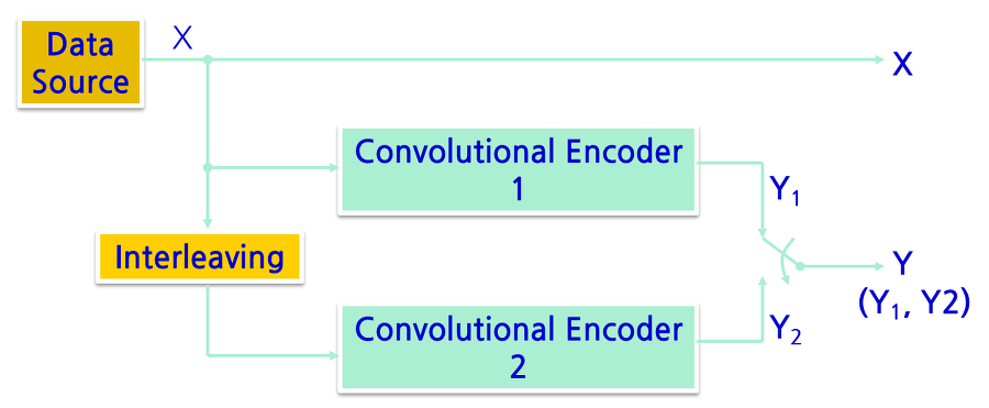 기본적으로 Convolutional Codes를 병렬연결한 방식으로 인터리빙(Interleaving) 기술을 이용하여 에러 복구 능력을 향상시켰다. 마찬가지로 자세히 언급하기엔 비전공자 입장에서 이해하기 힘든 기술적인 내용이므로 기본적인 구조도만 확인 해 보자.