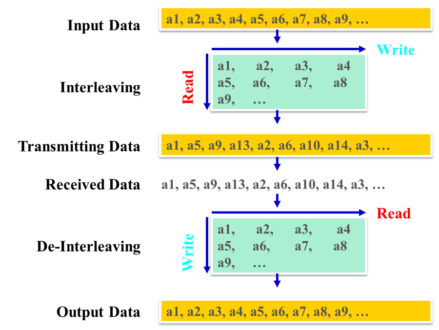 인터리빙은 이런 특징을 이용하여 송신측에선 보낼 데이터를 뒤섞어 보내고 수신 측에서는 뒤섞인 데이터를 다시 정렬하는 과정을 거친다. 이렇게 하면 어떤 구간에 burst한 오류가 발생 하더라도 실제 데이터에서는 한두비트씩 산발적으로 오류가 난것 처럼되는 것이다. 그럼 오류 복구율이 높아진다.