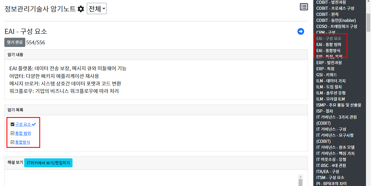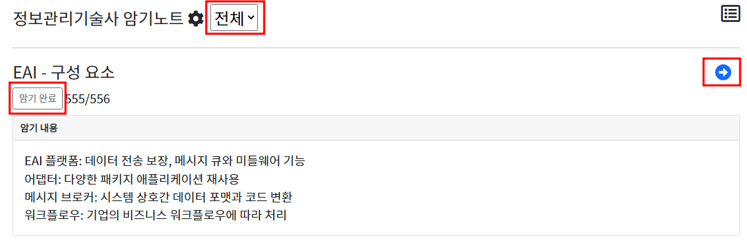처음엔 암기 내용에 가림막이 쳐진 형태로 보여진다. EAI의 구성요소에 대해서 제대로 대답하지 못했다면 빡빡이를 한번 쓰거나 입으로 몇번 읊은 뒤 다음 기회를 기약하며 파란색 화살표를 눌러 다음 문제로 넘긴다. 다음에 다시 만났을 때 EAI의 구성요소에 대해 제대로 떠올릴 수 있었다면 "암기완료" 버튼을 누르고 넘어가면 된다. 그럼 EAI의 구성요소는 다신 나오지 않는다.