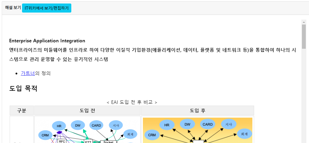 그리고 암기 노트이다 보니 상당히 축약된 형태로 암기를 하게 되는데, 내용이 이해가 안될 경우 아래 해설 보기를 통해 EAI에 관한 문서를 전체적으로 읽어볼 수도 있다. 이는 내가 여러번 소개한 IT위키라는 사이트의 API를 사용하여 연계해두었다. 아무나 수정 가능한 위키이므로 내용이 부족하다 싶으면 "IT위키에서 보기/편집하기" 버튼을 눌러서 수정을 할 수도 있다.