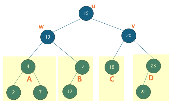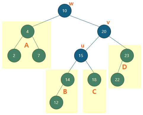 그리고 그 아래에 있던 서브트리들은 새로운 부모에 그대로 같은 순서로 배치시켜 주면 신기하게도 균형이 맞는다. 여기서 쿨한 점은 조상 입장의 u v w를 직관적으로 재배열한 뒤, 그 아래의 서브트리들은 그냥 그대로 위치를 유지시키고 바뀐 조상이랑 연결만 시켜주면 깔끔하게 규칙이 맞는다는 것이다. 물론 이 또한 트리의 특성을 생각하면 너무 당연한 것이긴 해도 말이다.