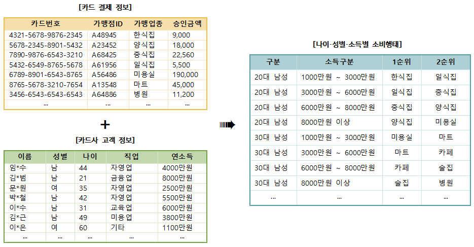 이런 개인화 서비스뿐만 아니라 기업 전략 수립에 사용되는 빅데이터 분석 또한 개인정보가 중요하게 사용되는 것은 마찬가지입니다. 직접적인 개인정보가 아니라도 가명화된 정보이거나 개인정보를 기반으로 만들어진 통계정보인 경우가 많습니다. 예를 들면, 상권 분석을 위해 꼭 필요한 지역별·시간대별 유동인구 데이터라던가, 가맹업종별·상품별 매출 데이터, 소비행태 데이터 같은 경우도 언뜻 보기엔 개인정보와 연관성이 없어 보이지만 그렇지 않습니다. 실제로 통신사 등에서 제공되는 지역별·시간대별 유동인구 데이터는 우리가 전화를 수발신하고 주변 기지국이랑 통신을 한 기록 데이터(CDR)를 기반으로 만들어집니다. 카드사에서 제공되는 소비·매출 분석 데이터 또한 우라가 결제한 신용카드 기록을 토대로 통계 처리하여 만들어진 데이터입니다.